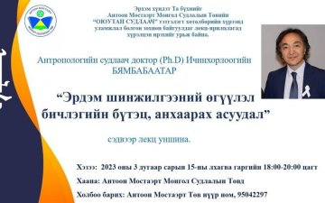 Эрхэм Та бүхнийг МУИС-ИЙН НҮҮДЭЛЧДИЙН АРХЕОЛОГИЙН ХҮРЭЭЛЭНГИЙН ЭРДЭМ ШИНЖИЛГЭЭНИЙ АЖИЛТАН Г. ЭНХБАЯРЫН “ЭРТНИЙ НҮҮДЭЛЧДИЙН УНАЛГЫН АДУУНЫ ТОНОГ ХЭРЭГСЛИЙН СУДАЛГАА” өгүүллийн бүтэц ба бичлэгийн задлан шинжилгээ сэдэвт лекц ярилцлагад хүрэлцэн ирэхийг урьж байна.