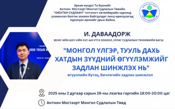 “XII зууны монголчуудын нийгмийн байгууллын судалгааны арга зүйн асуудал” сэдэвт лекц болно.