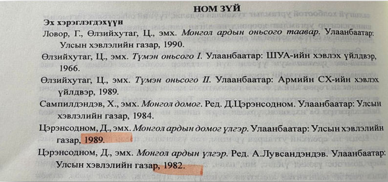 - Ном зүй хэсэгт үсгийн дарааллыг баримталсан ч тодорхой нэг зохиолчийн хоёр бүтээлийг оруулахдаа оны дарааллаар оруулбал зохистой.