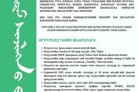 Дэлгэрэнгүй2026 ОНЫ 5 ДУГААР САРД ХЭВЛЭГДЭХ ХХX БОТИД ЭРХЭМ СУДЛААЧ ТАНЫГ ЭРДЭМ ШИНЖИЛГЭЭНИЙ ӨГҮҮЛЛЭЭ ИРҮҮЛЭХИЙГ УРЬЖ БАЙНА.